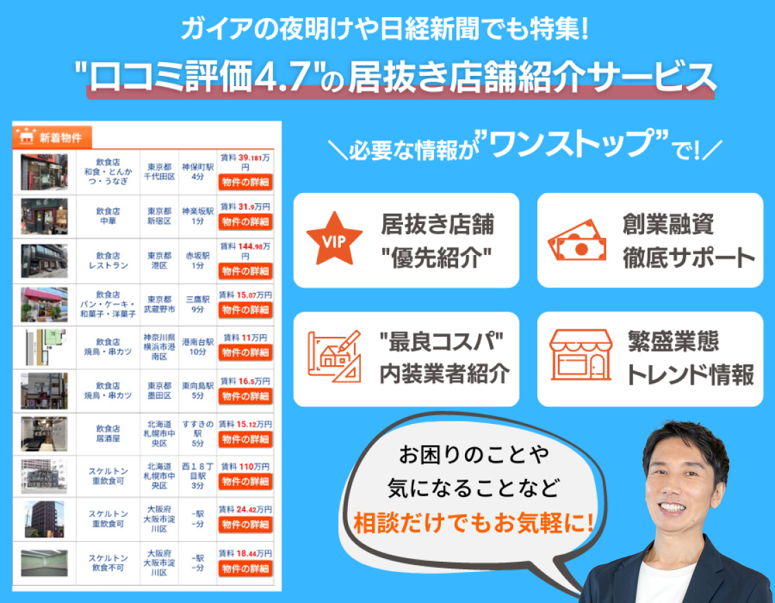 | 事業内容 | 1. 『店舗そのままオークション』の運営 2. 出店/独立開業のコンサルティング 3. 店舗売却サポート 4. 経理・労務その他バックオフィス業務のコンサルティング |